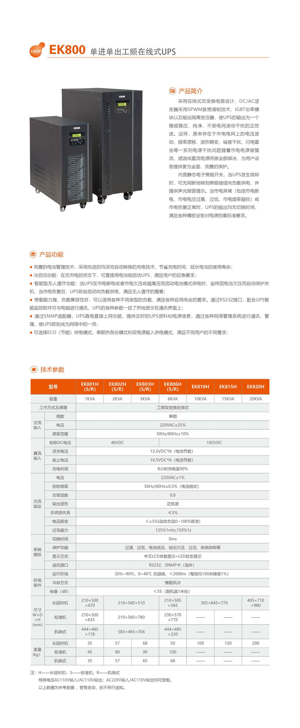 愛(ài)克賽EK800系列塔式單進(jìn)單出工業(yè)級工頻在線(xiàn)式UPS電源采用在線(xiàn)式雙變換電路設計,DC/AC逆變器采用SPWM脈寬調制技術(shù)、IGBT功率模塊以及輸出隔離變壓器,使UPS的輸出為一外穩頻穩壓、純凈、不受電網(wǎng)波動(dòng)干擾的正弦波電源。