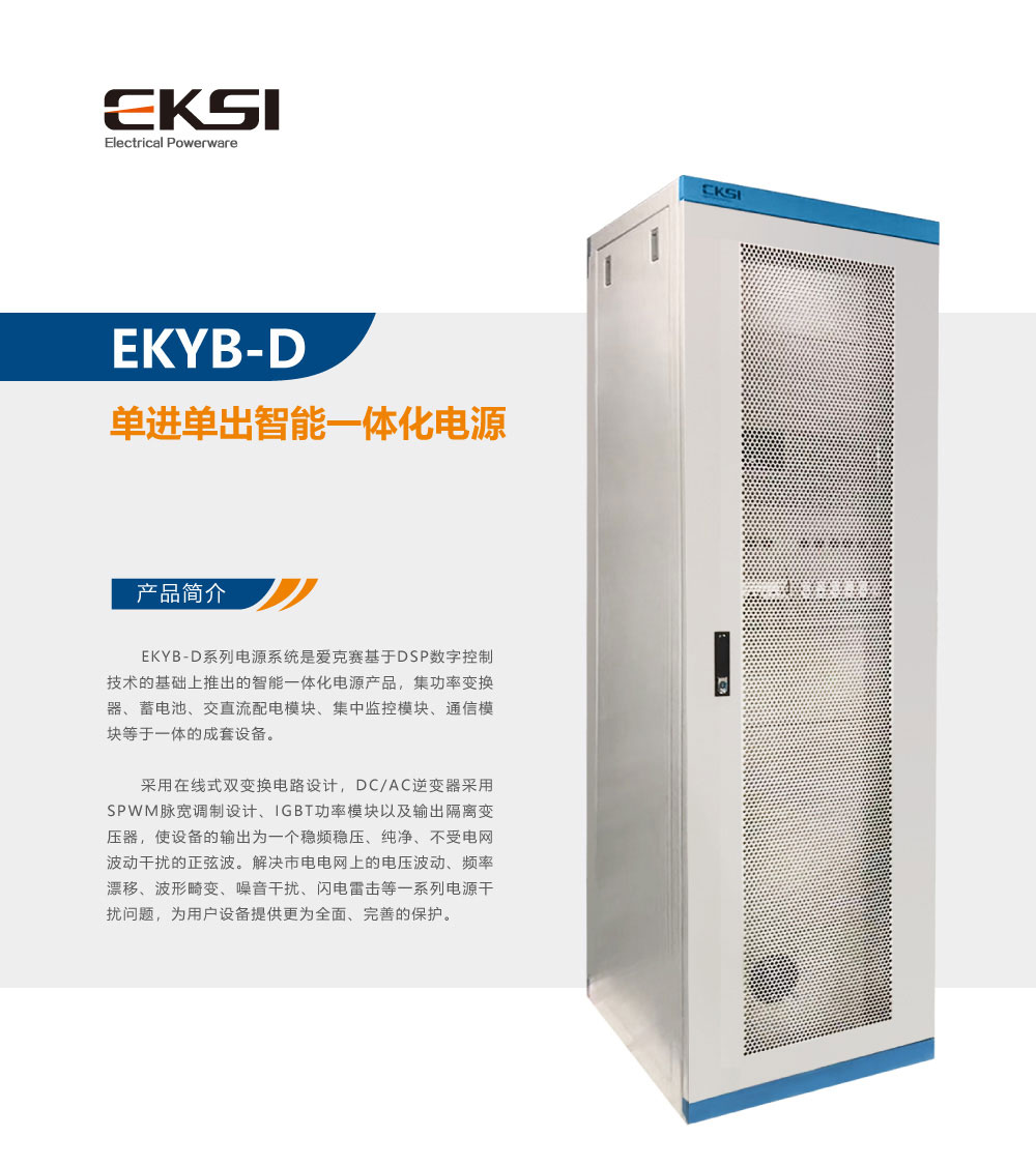 EKYB-D系列電源是單相小功率一體化電源產(chǎn)品,愛(ài)克賽基于DSP數字控制技術(shù)有基礎上推出的智能一體化電源產(chǎn)品,集成了功率變換器、蓄電池、交直流配電模塊、集中監控模塊、通信模塊于一體的成套設備。